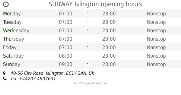 It is also possible to : Edit these OPENING HOURS of Cafe SUBWAY In Islington, 40-56 City Road,
